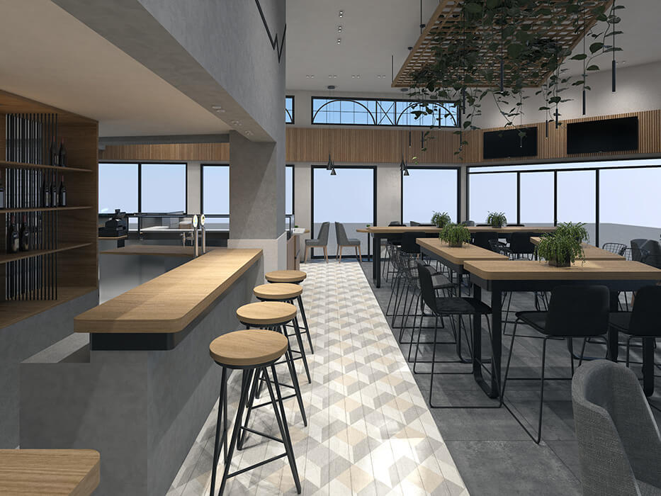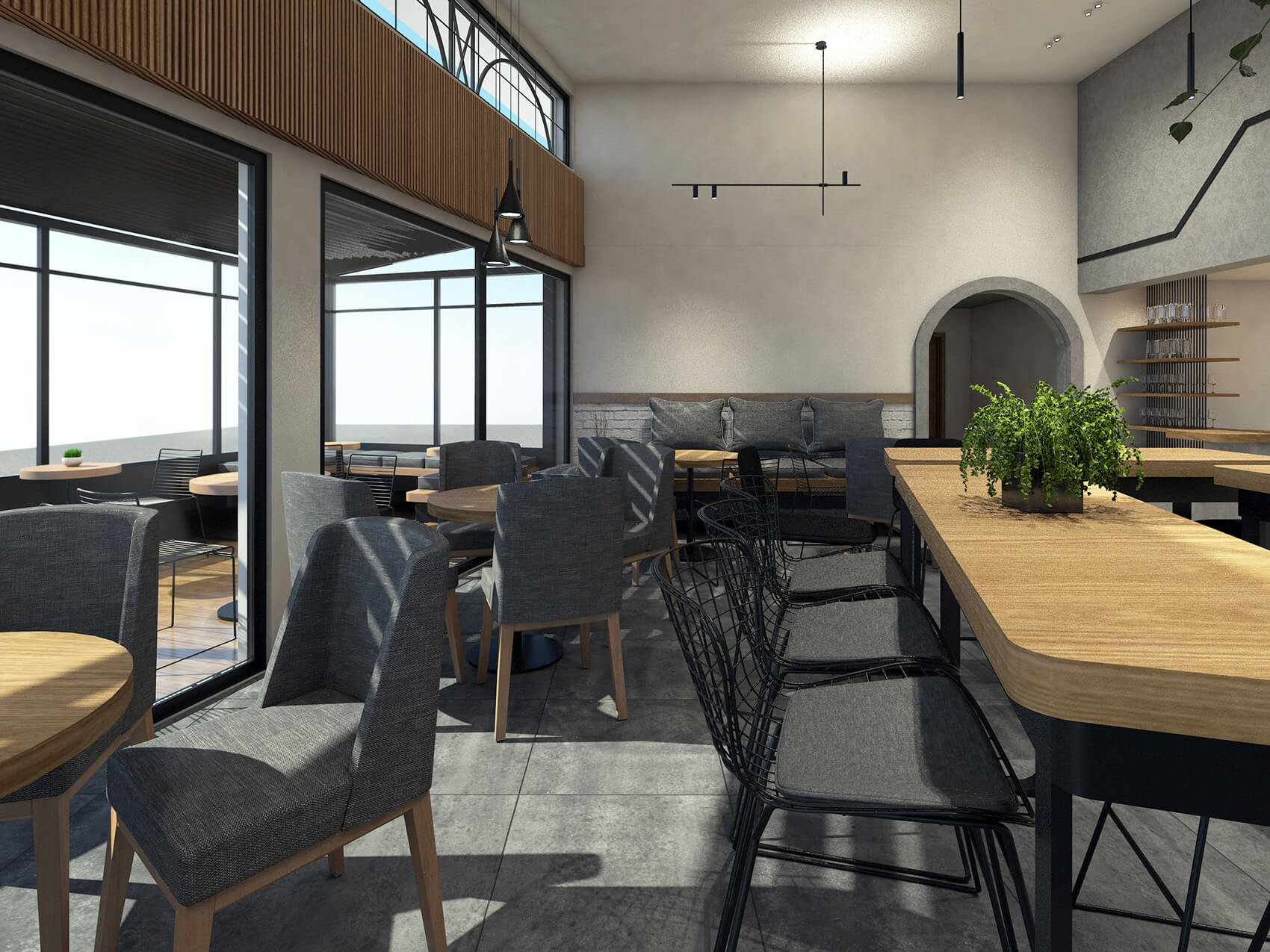 Η εσωτερική διαμόρφωση βασίστηκε σε μια λιτή, σύγχρονη αισθητική, που ενσωματώνει στοιχεία Industrial Minimal με έμφαση στις θερμές υφές. Επιλέχθηκαν φυσικά υλικά, όπως το ξύλο για τις επιφάνειες εργασίας και τα ράφια, σε συνδυασμό με την τσιμεντοκονία και το μέταλλο, δημιουργώντας μια φιλική και λειτουργική ατμόσφαιρα. Αξιοποιώντας το φως, το ξύλο και τη φυτική διακόσμηση (Biophilic Design) ενισχύσαμε την αίσθηση οικειότητας και την εμπειρία παραμονής στον χώρο.