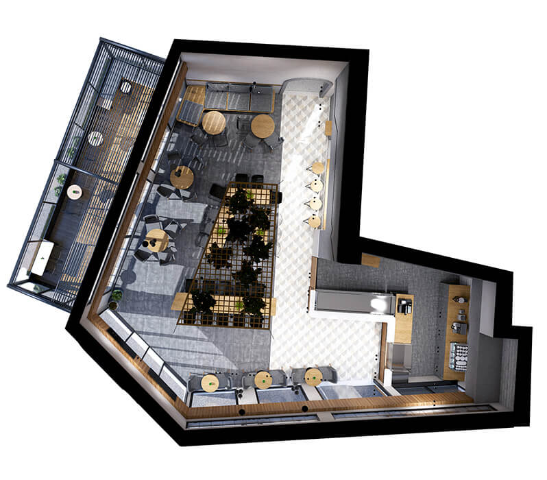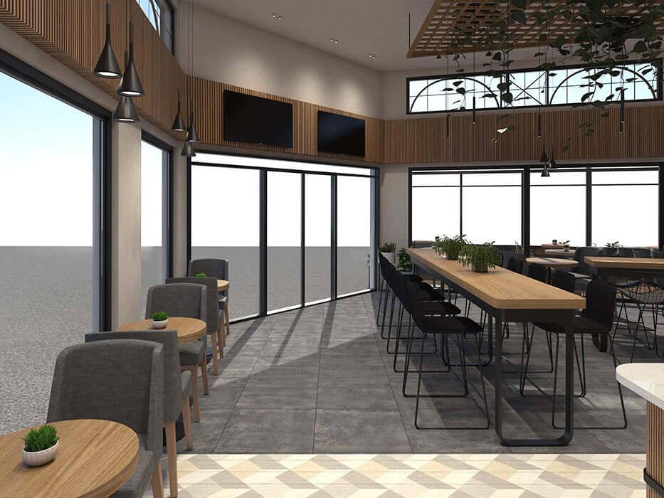 Ένα σημαντικό στοιχείο ήταν η διασύνδεση του εσωτερικού με τον εξωτερικό χώρο. Επιλέξαμε μεγάλες, διαφανείς επιφάνειες και προσθέσαμε έναν ημι-υπαίθριο χώρο καθιστικού με γυάλινη περίφραξη και φύτευση, ώστε να πετύχουμε μέγιστη διάχυση από φυσικό φως στο εσωτερικό. Παράλληλα, η συγκεκριμένη διαμόρφωση δημιούργησε μια ελκυστική εικόνα για τον περαστικό, που τον προσκαλεί να επισκεφθεί το κατάστημα.